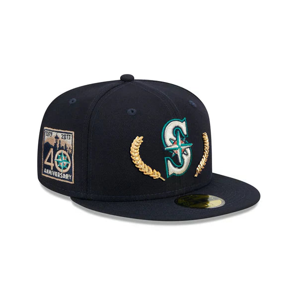 The Seattle Mariners Gold Leaf 59FIFTY Fitted Cap showcases an embroidered Mariners logo and gold leaf pins on the front panels, along with a matching MLB Batterman logo on the rear. Additional features include a 40th Anniversary patch on the right side and a gray undervisor, adding a touch of elegance to the cap's design.